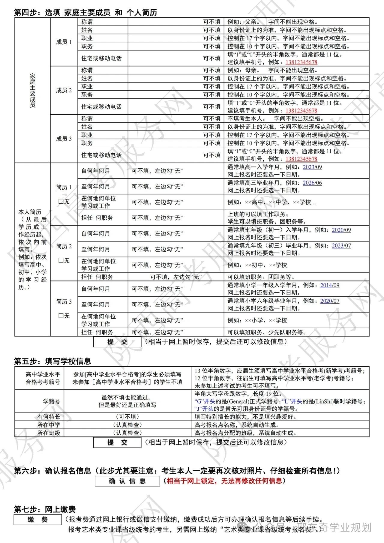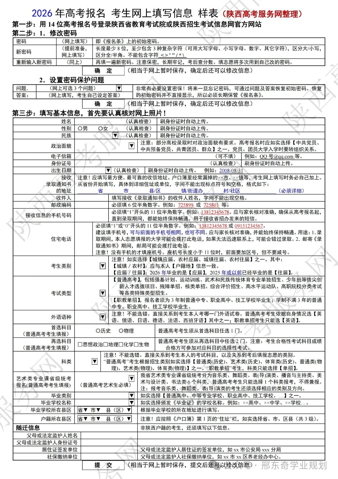 我省2026年高考网上报名工作即将启动。 为帮助考生顺利完成报名,现分享高考报名考生网上填写信息样表,请各位考生及家长认真对照样表内黑体字标注的关键要求,提前准备相关材料,熟练掌握网报内容及要求,避免因材料不全或信息错误影响报考。 高考报名考生网上填写信息样表 特别提示 🔶高考报名号:去考点刷身份证系统自动生成14位,以61开头; 🔷学籍号:G+身份证号(共19位) 🔶考籍号:即高中学业水平考试号 🔷准考证号:招办后期统一编制10位(后续申请特殊类型招生需要提供的考生号:在准考证号前加2661,26代表26年高考,61代表陕西) 🔶考生类别:城市应届、城市往届、农村应届、农村往届 🔷考试类型:统考、单招(单招必须是中专、技校、职高“三校生”) 🔶招生类别:普通类、艺术类、体育类 🔷选考科目:首选科目“历史、物理”二选一;再选科目“政治、地理、化学、生物”四选二 🔶报考科类:普通类(历史)、普通类(物理)、艺术类(历史)、艺术类(物理)、体育类(历史)、体育类(物理)
