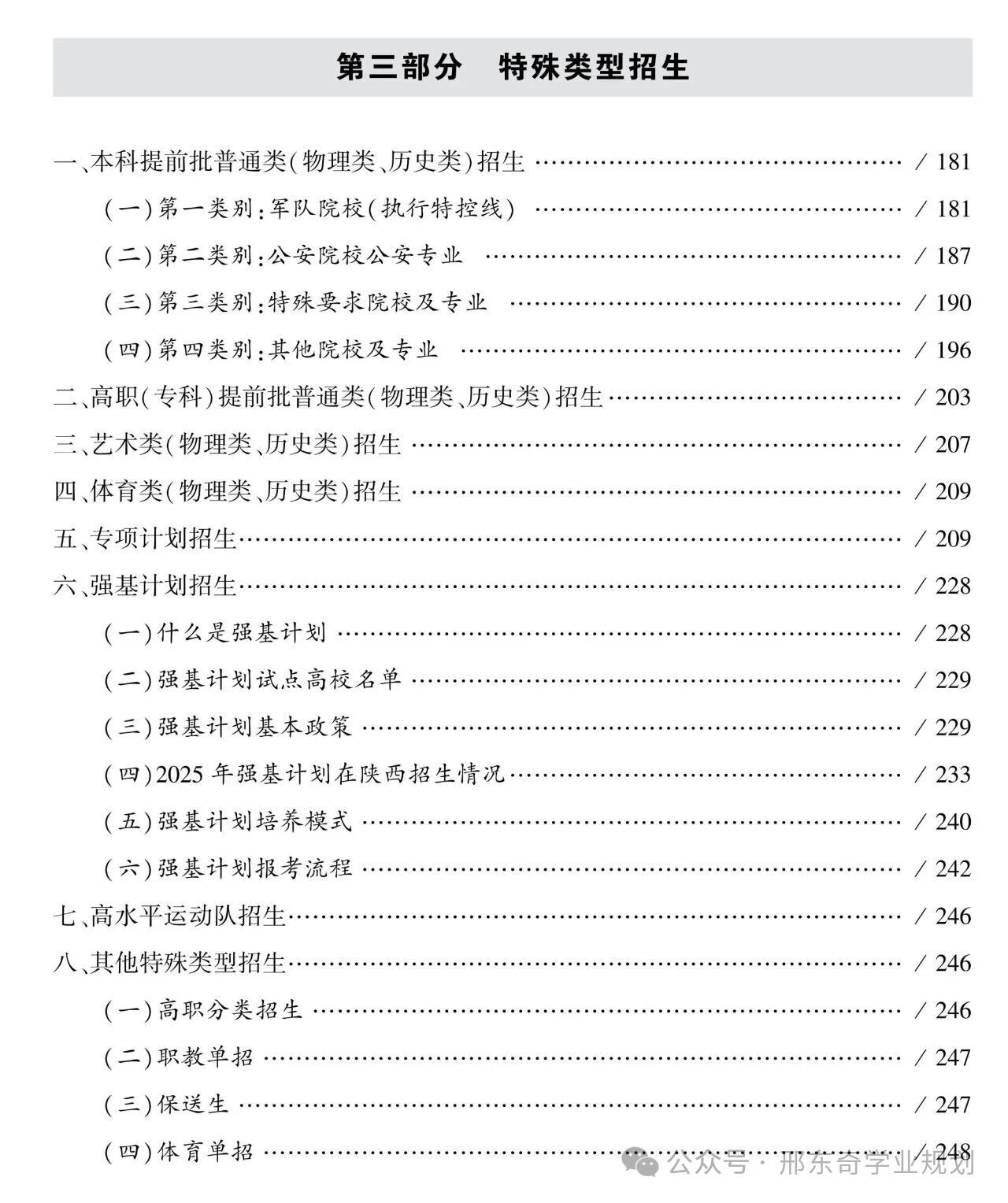 《陕西高考大数据分析》(2026新高考版)向考生重点介绍强基计划招生、综合评价招生、港澳高校自主招生、军队院校招生、公安司法类院校招生、公费师范、优师计划、免费医学定向培养、空军招飞、海军招飞、民航招飞、小语种招生、马克思主义理论、艺术类招生、体育类招生、定向培养军士、脱贫地区专项计划等特殊类招生的相关内容,让符合条件的考生熟悉特殊类招生录取形式,争取更多录取机会,特别是就业有保障的录取机会。