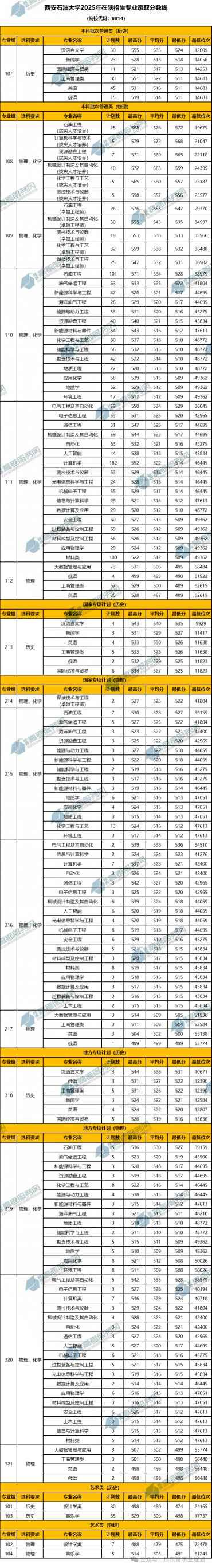 西安石油大学2025年各批次的专业录取分数线如下: