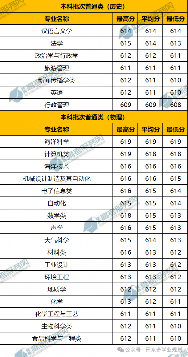 2、中国海洋大学在本科批次普通类招收历史类、物理类考生,录取情况如下: