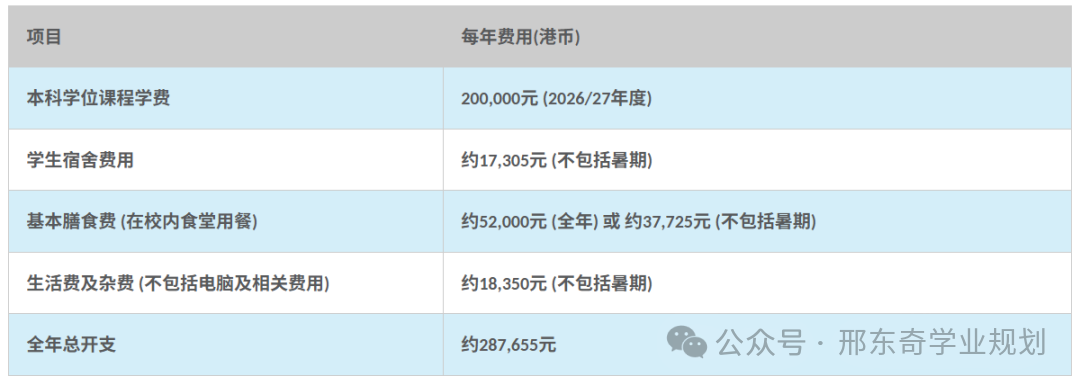 以下图表列出如入住本校学生宿舍,每年的费用约需港币287,655元。估计仅供参考,个别课程可能花费更多。