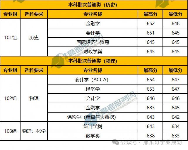 1、上海财经大学在本科批次普通类招收历史类、物理类考生,录取情况如下: