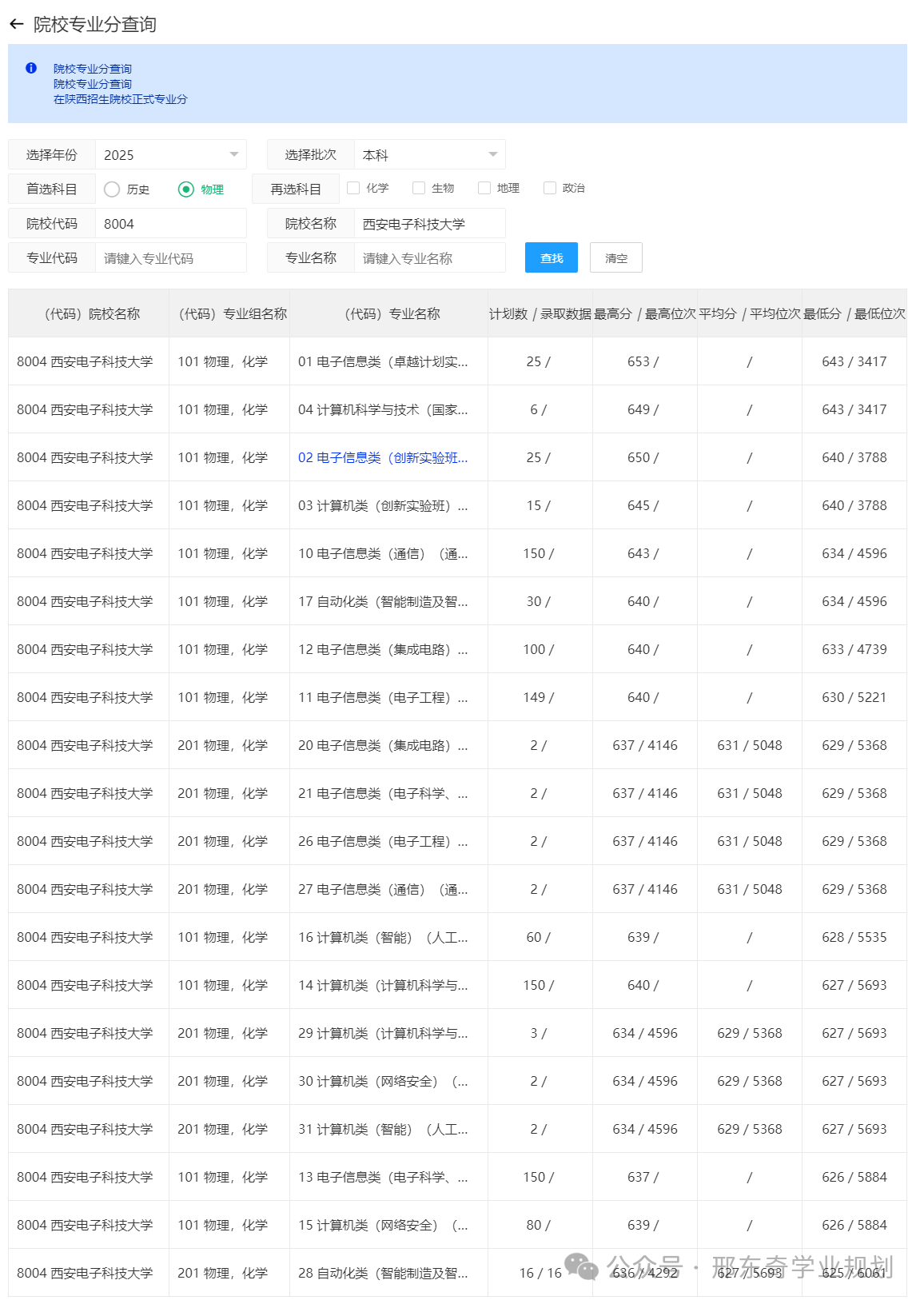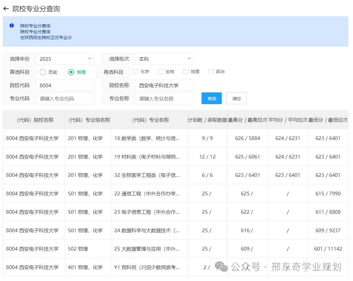 选择“2025年”、首选科目“物理”、院校名称“西安电子科技大学”,搜索结果如下: