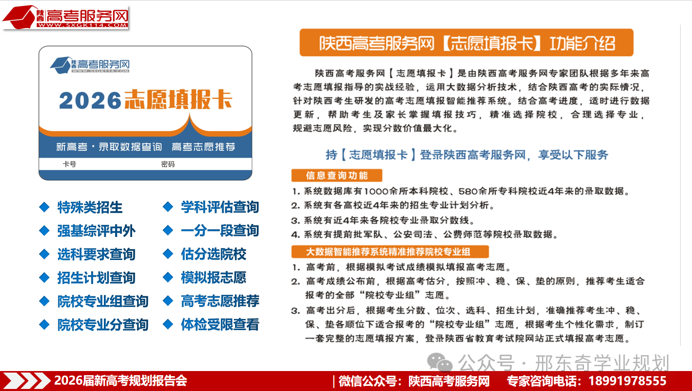 陕西高考服务网专家团队拥有数十年高考志愿填报的丰富经验,运用先进的大数据分析技术,针对陕西新高考的实际情况,专门为陕西考生研发的新高考志愿填报智能推荐系统【志愿填报卡】。结合高考进程和重大信息发布的节点,每年进行五次数据更新。该系统上线11年来,帮助数十万考生精准填报高考志愿。
