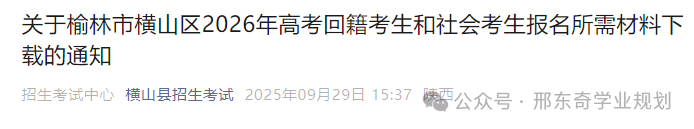 关于榆林市横山区2026年高考回籍考生和社会考生报名所需材料下载的通知