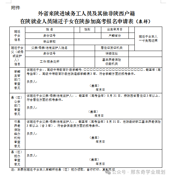 1. 拟在陕报名参加高考的随迁子女,要在高考报名前,到学籍所在县(区)招办提出申请并领取《外省来陕进城务工人员及其他非陕西户籍在陕就业人员随迁子女在陕参加高考报名申请表》(表样见附件),在各地规定的时间内分别前往本人学籍所在主管部门、父亲或母亲或法定监护人居住登记地县(区)公安部门、参加缴纳职工基本养老保险的市养老保险经办处或县(区)养老保险经办中心办理报名资格审查手续。
