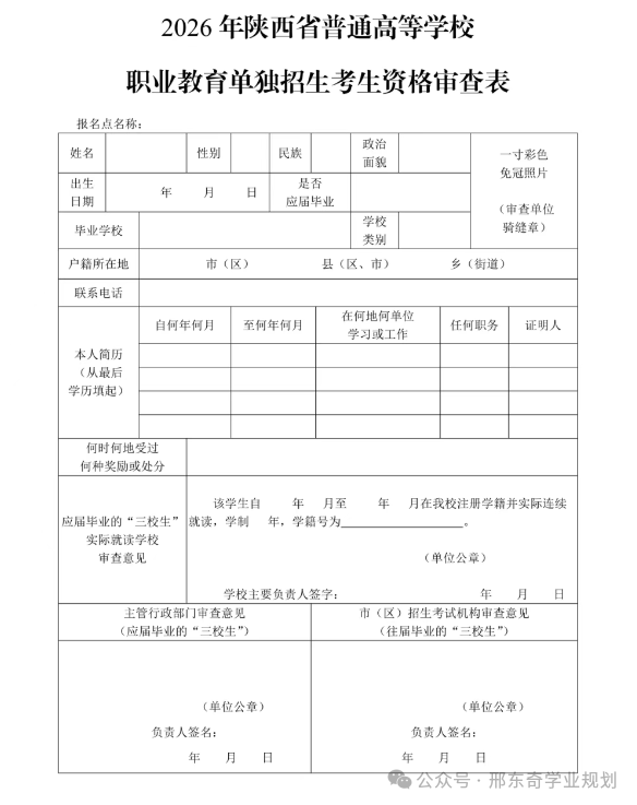 4、2026年陕西省职业教育单独招生考生资格审查表(三校生用):三校生资格审查表