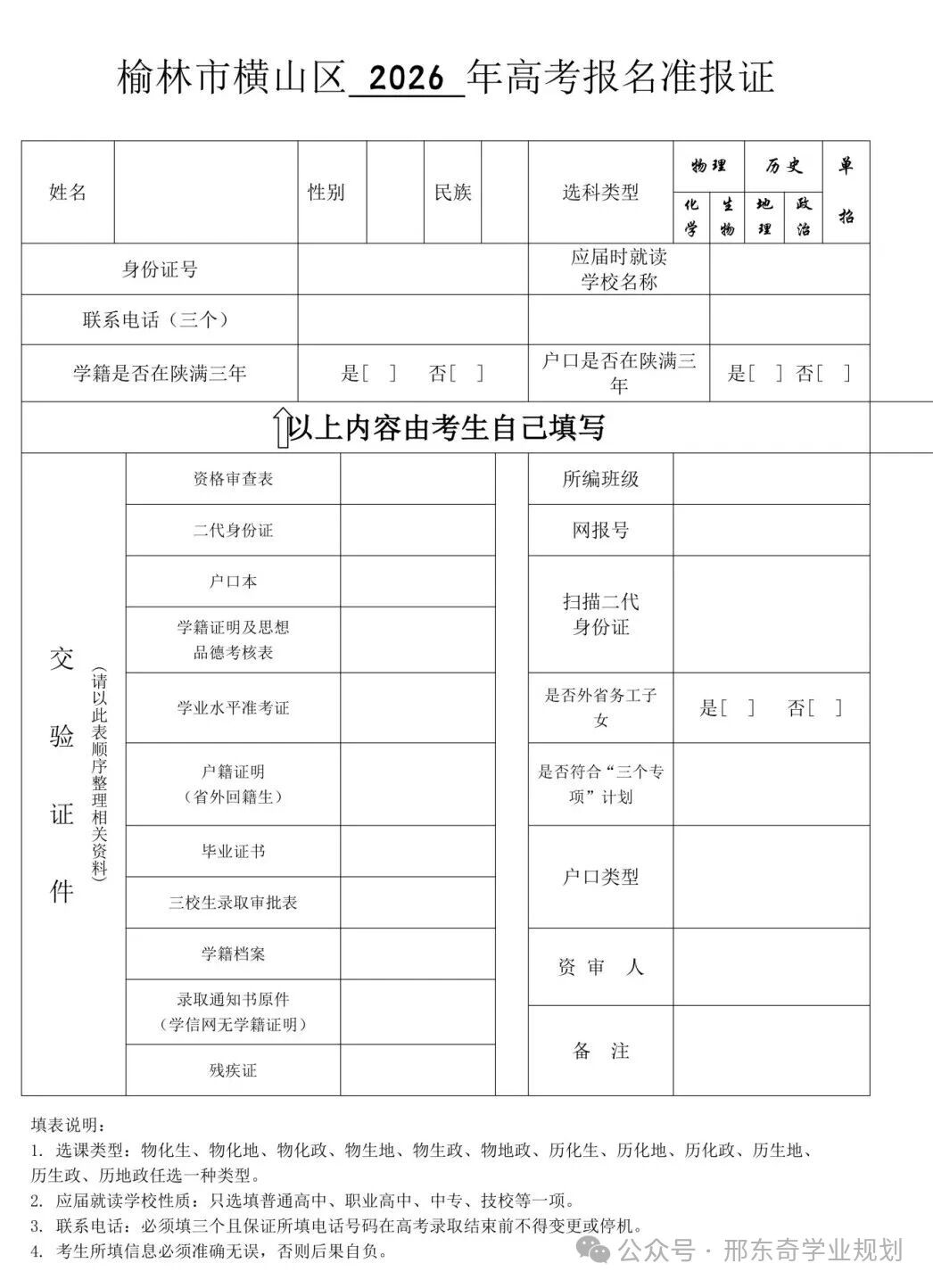 2、横山区2026年普通高校招生考试资格审查表(背面):审查表背面