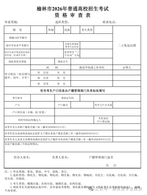1、横山区2026年普通高校招生考试资格审查表(正面): 审查表正面