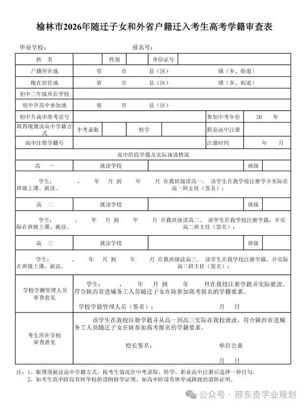 5、榆林市2026年随迁子女和外省户籍迁入考生高考学籍审查表:身份证号开头“非61”考生学籍审查表