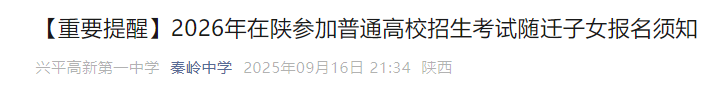 兴平市高新第一中学:《2026年在陕参加普通高校招生考试随迁子女报名须知》