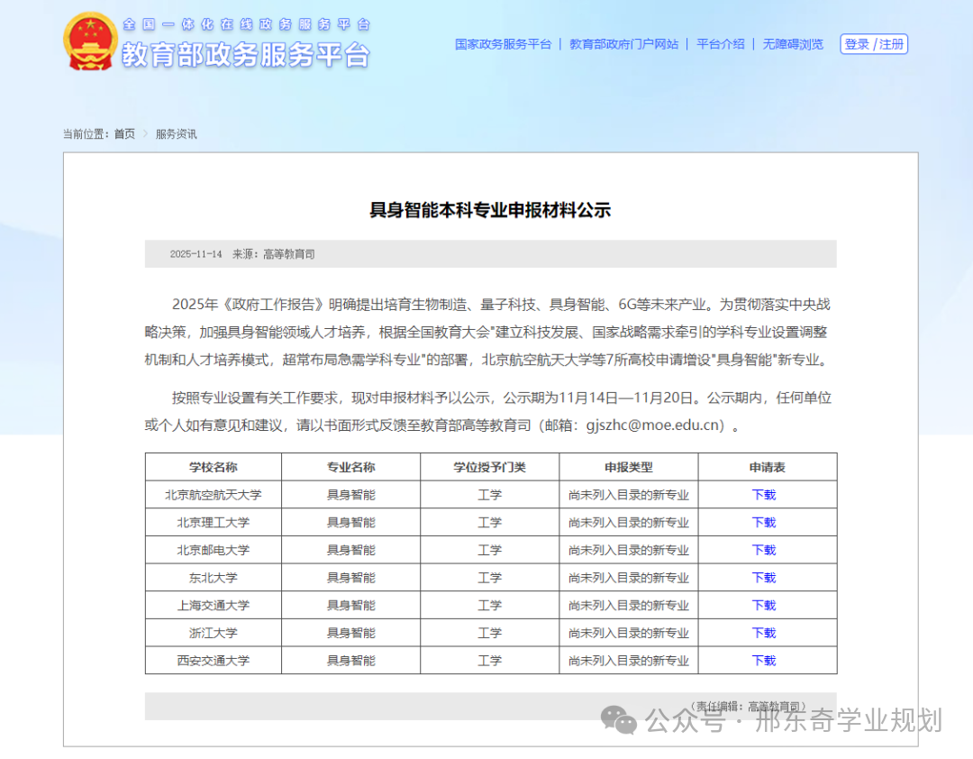 11月14日,教育部政务服务平台网站发布具身智能本科专业申报材料公示。